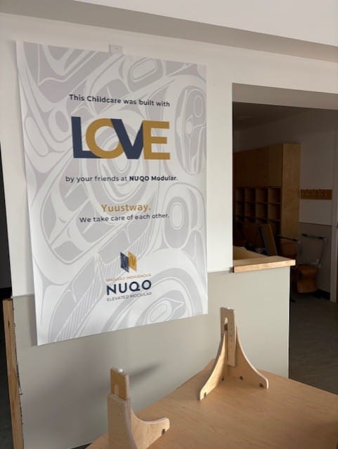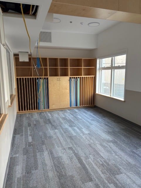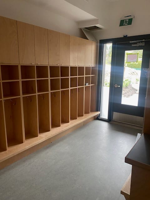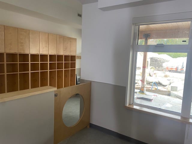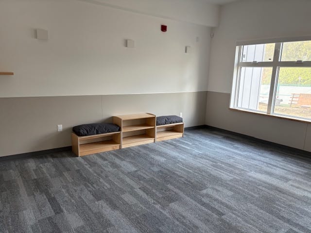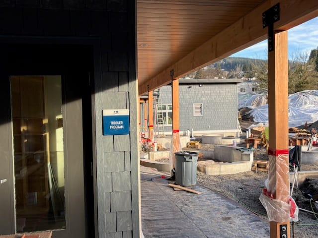 Our main entrance was purpose‑built by the amazing team at Nuqo to reflect our commitment to creating a welcoming space for all who enter our West Vancouver Schools Early Childhood Education Centre. Upon entry, to the right, is our community room, which will serve as a multi‑purpose space for intergenerational, family‑focused programming, as well as before‑ and after‑school care. We are excited about the slate of programming coming together to serve our community in new and innovative ways.
