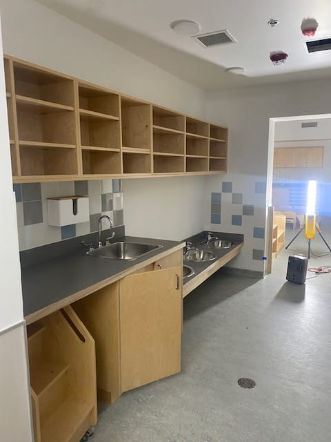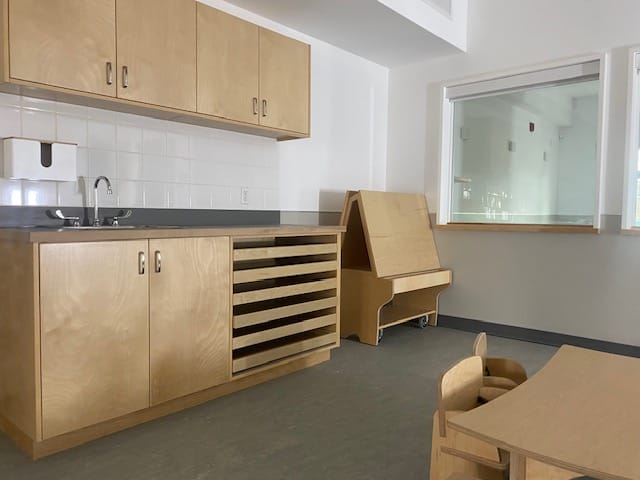 We also had custom‑built climbing ladders designed for our littlest learners, allowing them to independently climb onto change tables, with the hope of alleviating some of the very real physical lifting our educators do as they care for young children. The shared kitchen spaces between classrooms were also intentional, providing opportunities for overlap and relational connectivity among staff as we build community within our new child care centre.