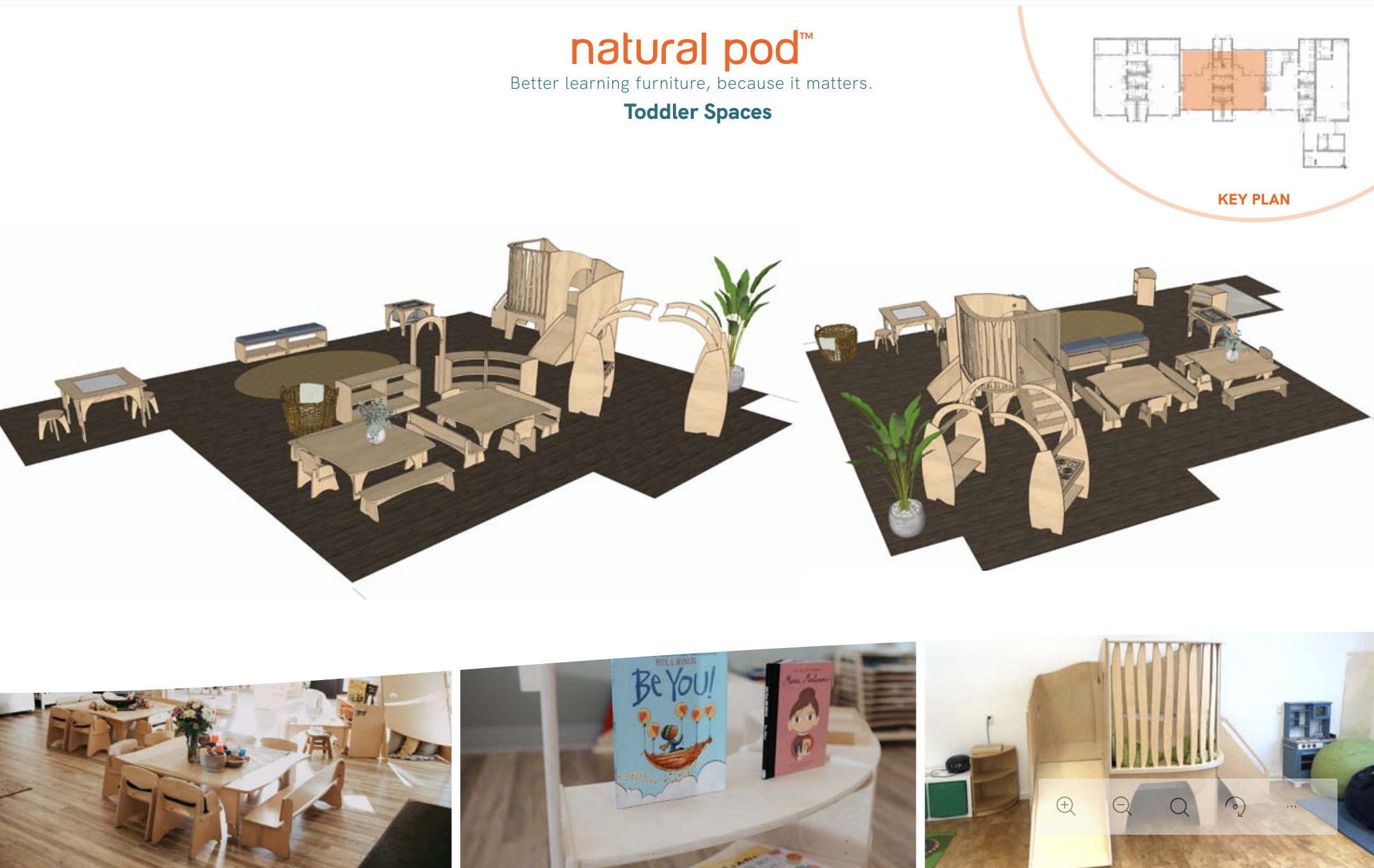 The neutral, light maple tones of the wood were intentionally chosen to align with the Natural Pod furnishings and to draw our design together cohesively. Our concept design work with the team at Natural Pod inspired us to ensure the rest of the building reflected these neutral tones, where beauty, respect for childhood, design, and pedagogy intersect. Their products are scaled specifically for young children and honour how they move, explore, and make meaning in the world. Once again, the soft, nature‑based, open‑ended designs bring calm and warmth into our early childhood educational space.